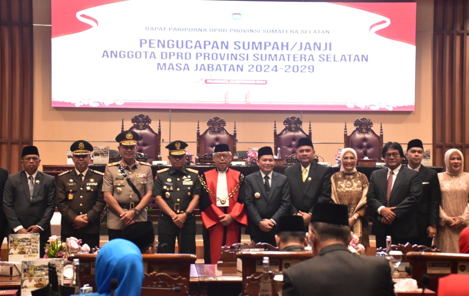 Acara Pelantikan serta Pengambilan Sumpah Jabatan Anggota DPRD Prov Sumsel ini dihadiri juga oleh PJ Gubernur Sumsel Elen Setiadi,SH.,M.S.E., Wakapolda Sumsel Brigjen Pol M. Zulkarnain S.I.K.,M.Si., Asisten Tindak Pidana Militer Kejati Sumsel Kolonel Chk. Askari, S.H., M.H., Kepala Pengadilan Tinggi Sumsel Nugroho Setiadji, Kepala Pengadilan Tinggi Agama Sumsel Dr. H. M. Sutomo, S.H., M.H., Kepala PTTUN Achmad Syaifullah, S.H., dan Sekda Prov. Sumsel Drs.H.Edward Candra, M.H., Kapolresta Palembang Kombes Pol Dr. Haryo Sugihartono, S.I.K, M.H., dan Kabinda Sumsel Bpk. Sudadi, S.H., M.Si.,