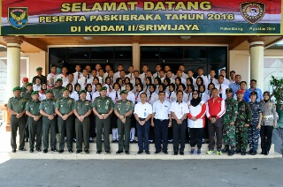 Pangdam II/Swj Mayjen TNI Sudirman S.H, M.H, Rabu (3/8/2016) menerima kunjungan 50 peserta Pasukan Pengibar Bendera Pusaka (Paskibraka) Provinsi Sumsel beserta 22 orang pendamping yang dipimpin oleh Kadispora Provinsi Sumsel Bpk. H. Ahmad Yusuf Wibowo, bertempat di gedung Jenderal Sudirman Makodam II/Swj Palembang.