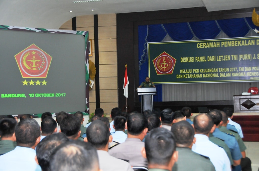 Demikian disampaikan Panglima TNI Jenderal TNI Gatot Nurmantyo saat memberikan pembekalan kepada 951 Perwira Siswa (Pasis), terdiri atas 138 Pasis Sesko TNI, 61 Pasis Sespim TI, 272 Pasis Sesko AD, 122 Pasis Sesko AL, 100 Pasis Sesko AU dan 258 Pasis Sespimmen, dengan tema “Melalui Program Kegiatan Bersama (PKB) Kejuangan, TNI dan Polri Bertekad Memantabkan Kembali Integritas, Stabilitas Dan Ketahanan Nasional Dalam Rangka Menegakkan Kedaulatan Dan Mempertahankan Keutuhan NKRI” di Gedung Soedirman Secapaad, Bandung, Jawa Barat, Selasa (10/10/2017).