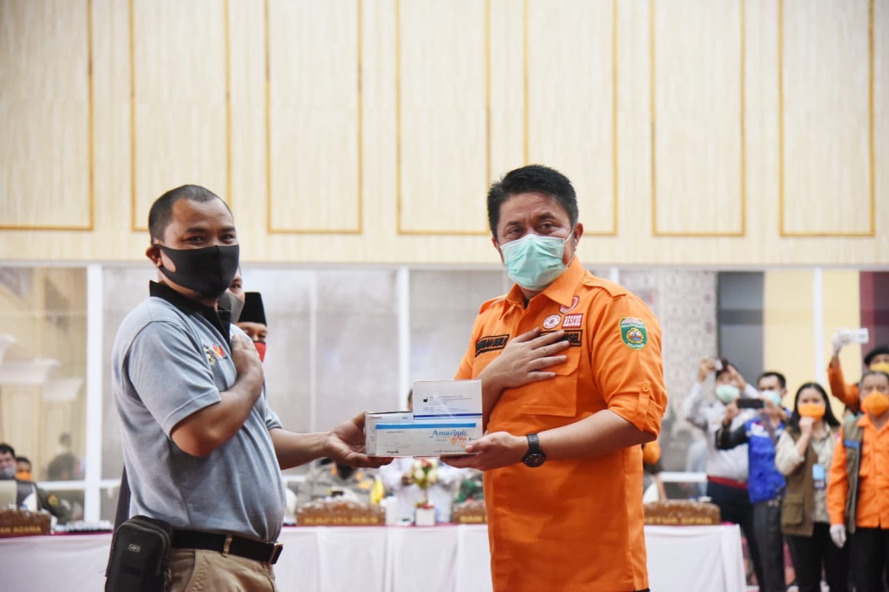 Disela-sela kunjungannya Gubernur Sumsel Herman Deru memberikan bantuan berupa Alat Pelindung Diri (APD), Rapit Test dan Disinfektan. Ditambah juga bantuan Cairan Pembersih Lantai dari Palang Merah Indonesia (PMI) Provinsi Sumsel untuk Pemkab Musirawas.
