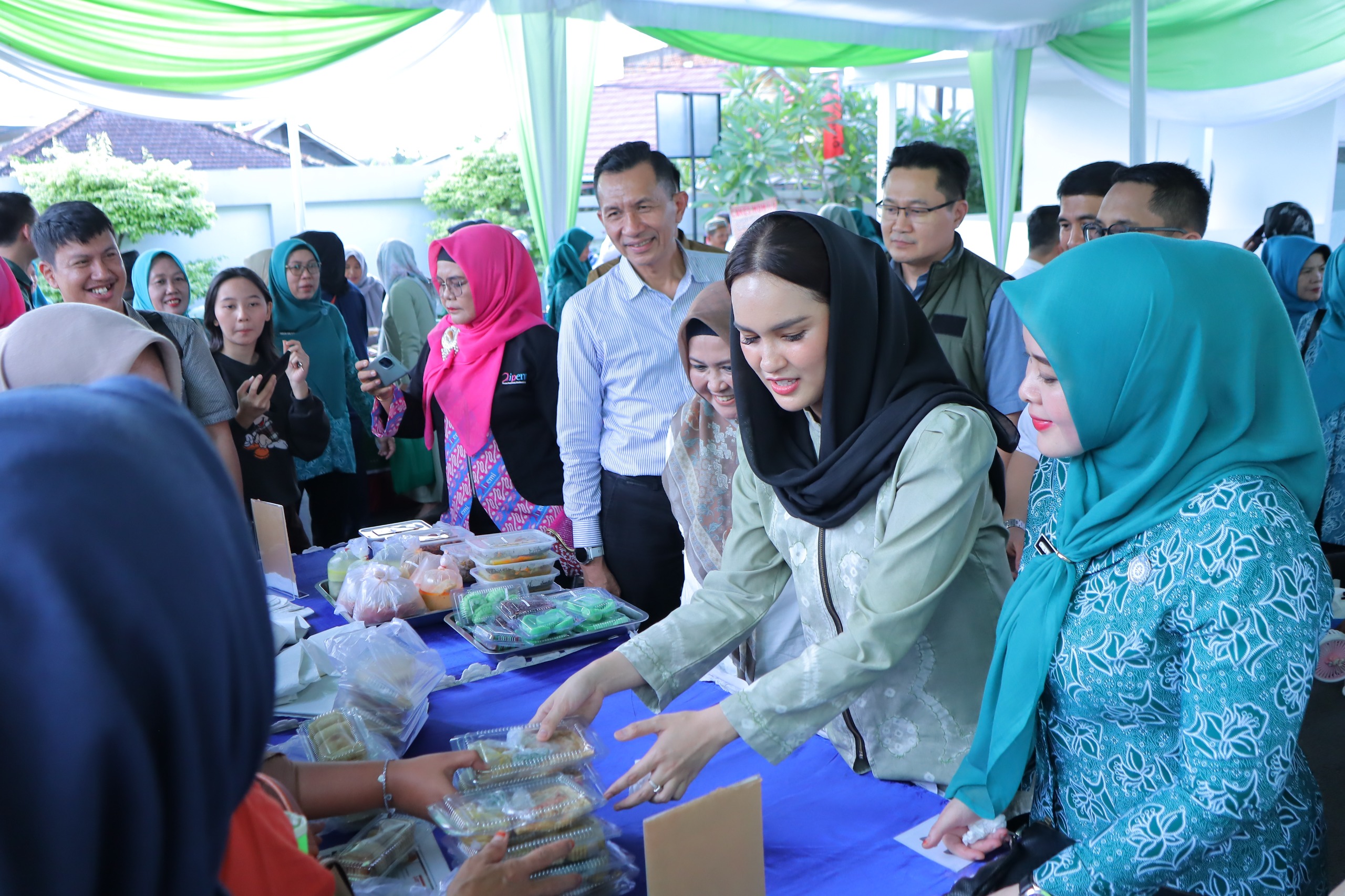 PALEMBANG – Wakil Ketua TP PKK kota Palembang Putri Azizah Prima Salam bersama Ketua Dharma Wanita Kota Palembang ibu Hj. Ida Royani Aprizal berikan apresiasinya terhadap Kegiatan Pasar Bedug Ramadhan yang digelar oleh Kantor Camat Kemuning kota Palembang besama Bank Sumsel Babel selaku sponsor, Rabu (12/03).