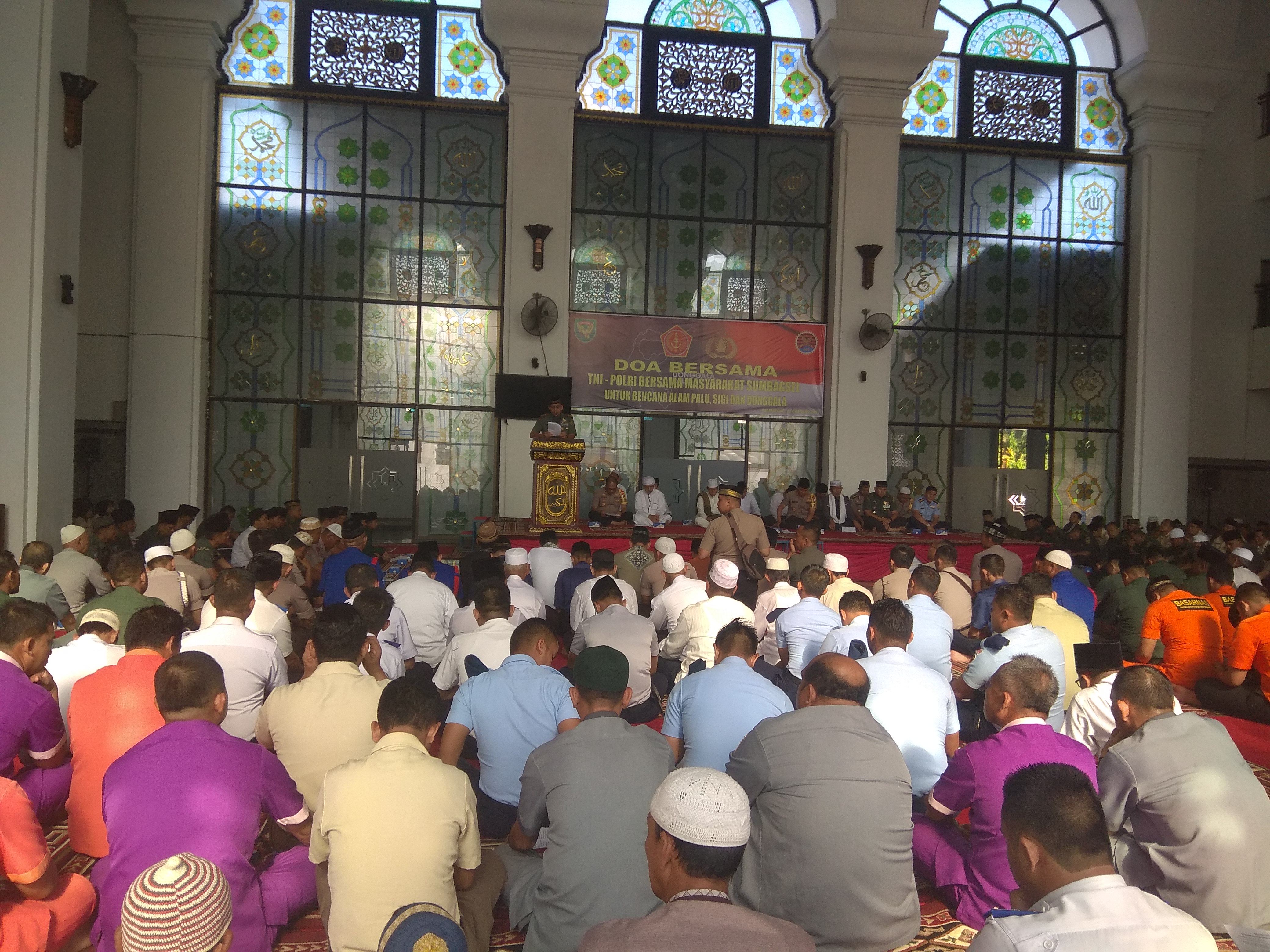 Kodam II Sriwijaya bersama Polri serta masyarakat menggelar doa bersama korban gempa Palu, Sigi dan Donggala bertempat di Masjid Agung Rabu (10/9) Palembang