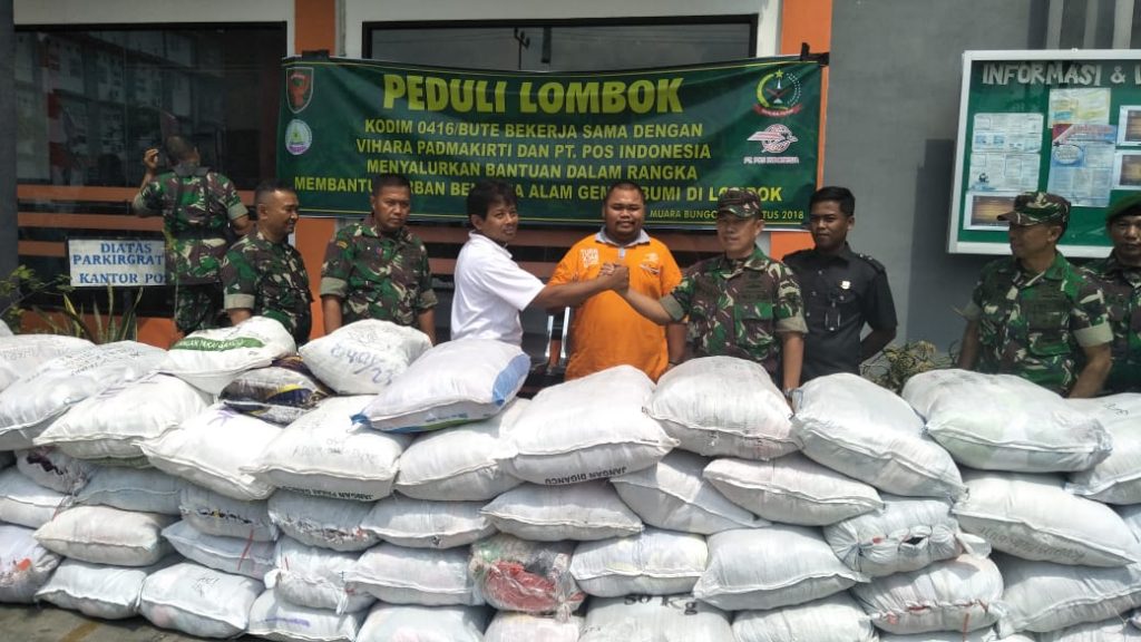 Peduli korban gempa di Lombok NTB, Kodim 0416/Bute, bekerjasama dengan Vihara Padmakirti, dan PT.Pos Indonesia, menyalurkan 70 karung baju layak pakai akan dikirim ke Lombok Nusa Tengara Barat (NTB).