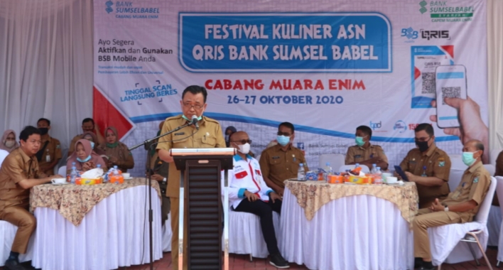 PT. Bank Pembangunan Daerah Sumatera Selatan dan Bangka Belitung atau Bank Sumsel Babel (BSB) Kantor Cabang Muara Enim melaksanakan sosialisasi produk layanan transaksi nontunai berbasis kode bar QRIS (Quick Response Code Indonesian Standard) di halaman Kantor Bupati Muara Enim.Senin (26/10/2020)