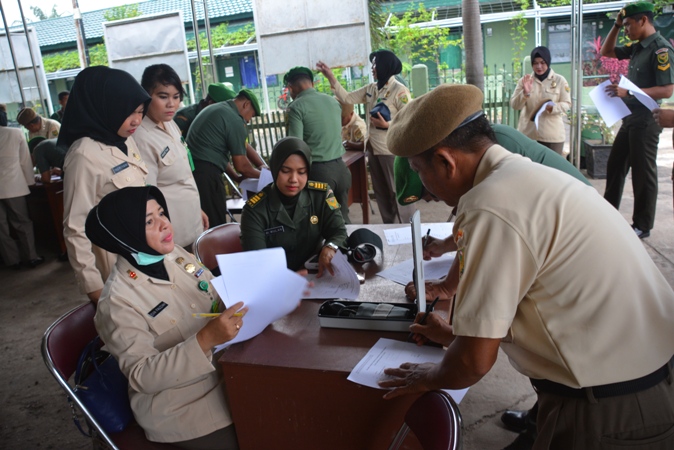 Personel prajurit TNI dan Pegawai Negeri Sipil (PNS) jajaran Korem 044/Gapo di wilayah Garnizun Palembang melaksanakan pemeriksaan kesehatan (Rikkes) berkala yang dilakukan oleh Detasemen Kesehatan (Denkes) 02.04.04 Palembang bertempat di Pos Kesehatan Makorem 044/Gapo Jln. Jenderal Sudirman KM 4,5 Palembang, Rabu (7/3/2018).