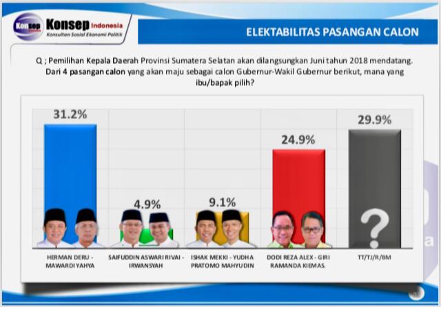 Pengenalan Herman Deru telah mencapai 92.4 persen dengan kesukaan sebesar 71.0 persen. Adapun popularitas 3 Cagub lainnya, antara lain : Saifuddin Aswari Rivai dikenal 50.3 persen disukai 50.2 persen, Ishak Mekki dikenal 79.8 persen disukai 62.9 persen dan Dodi Reza Alex dikenal 79.5 persen disukai 61.0 persen.