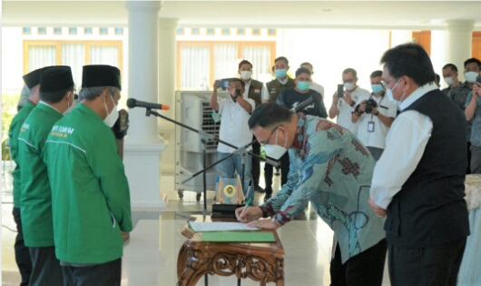 Penjabat (Pj) Bupati Muara Enim H Nasrun Umar (HNU) saksikan langsung Pelantikan Pengurus Majelis Daerah Koprs Alumni Himpunan Mahasiswa Islam (KAHMI) Kabupaten Muara Enim Periode 2021-2026 yang secara resmi dilantik oleh Ketua Umum Majelis Wilayah KAHMI Provinsi Sumatera Selatan H Joncik Muhammad di Balai Agung Serasan Sekundang, Kota Muara Enim, Rabu (28/7/21).