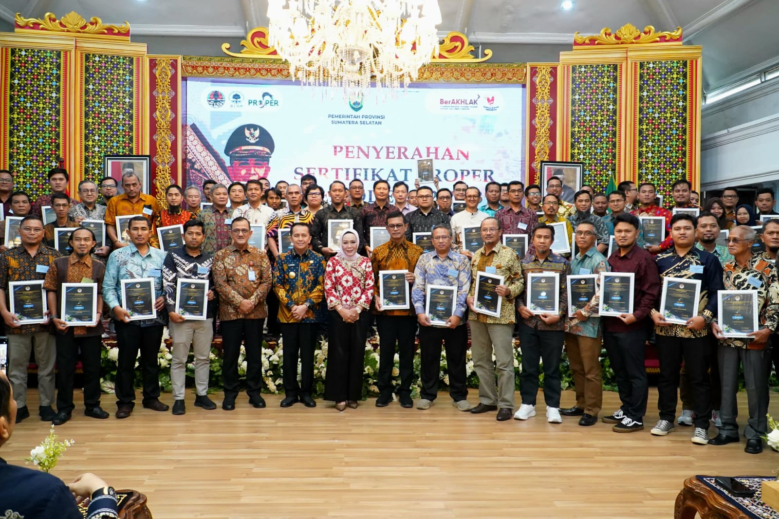 Palembang, Halosumsel -Penjabat (Pj) Gubernur Sumatera Selatan (Sumsel) Agus Fatoni menyerahkan sertifikat proper periode 2022-2023 untuk sejumlah BUMN dan Perusahaan Swasta Peduli Kelestarian Lingkungan. Kegiatan ini berlangsung di Griya Agung, Palembang, Sumatera Selatan, Jumat (29/3/2024).
