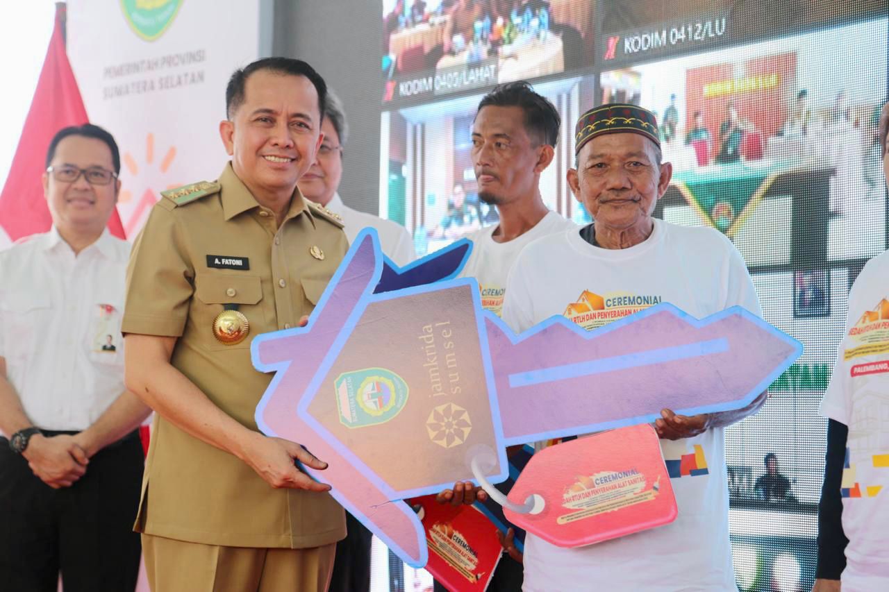 Palembang, Halosumsel -Penjabat (Pj) Gubernur Sumatera Selatan (Sumsel) Agus Fatoni menyerahkan kunci dan rumah baru bagi masyarakat yang rumahnya termasuk dalam program Gerakan Bedah Rumah Serentak se-Sumsel. Pemberian kunci tersebut diserahkan pada kegiatan Ceremonial Bedah Rumah Tidak Layak Huni (RTLH) dan Penyerahan Alat Sanitasi di Plaju, Palembang, Sumatera Selatan, Senin (3/6/2024).