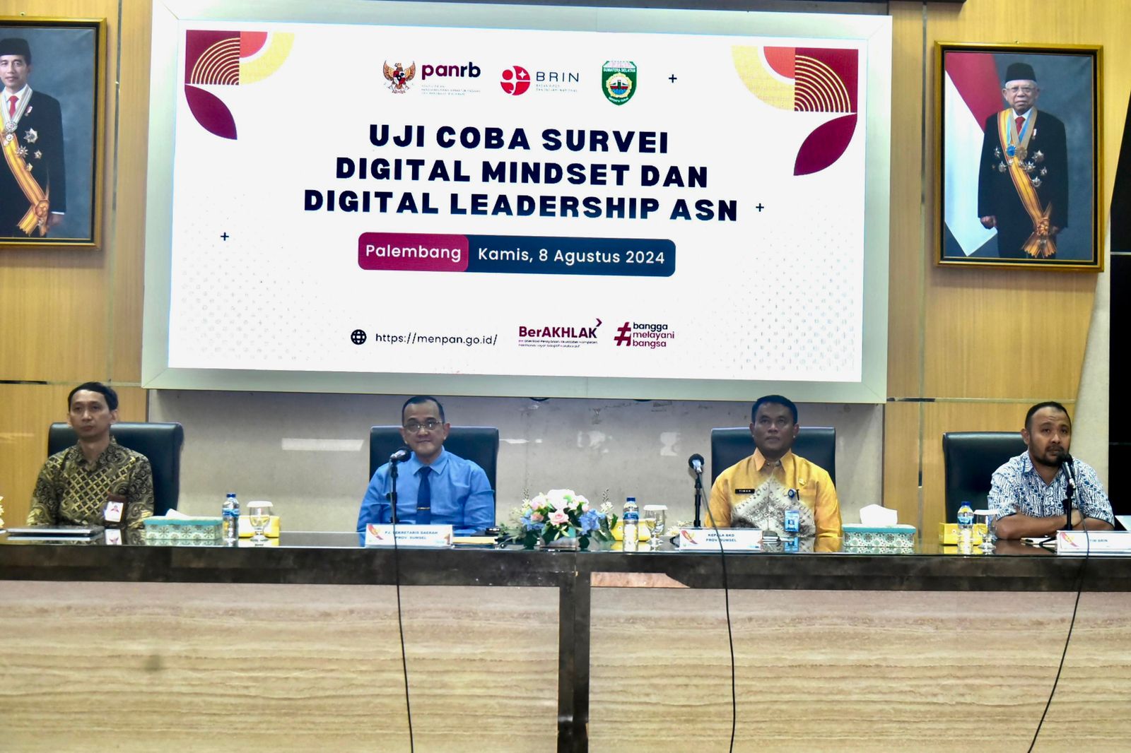 Palembang, Halosumsel -Pemerintah Provinsi (Pemprov) Sumatera Selatan (Sumsel) melakukan Uji Coba Survei Digital Mindset dan Digital Leadership Aparatur Sipil Negara (ASN) yang ditujukan untuk Percepatan Transformasi Digital Manajemen ASN dibuka oleh Asisten Deputi Percepatan Transformasi Digital Manajemen ASN Menpan RB RI, DR. IR. Katmoko Ari Sambodo, M. ENG secara virtual, bertempat di Auditorium Bina Praja Pemprov Sumsel, Kamis (8/8/2024).