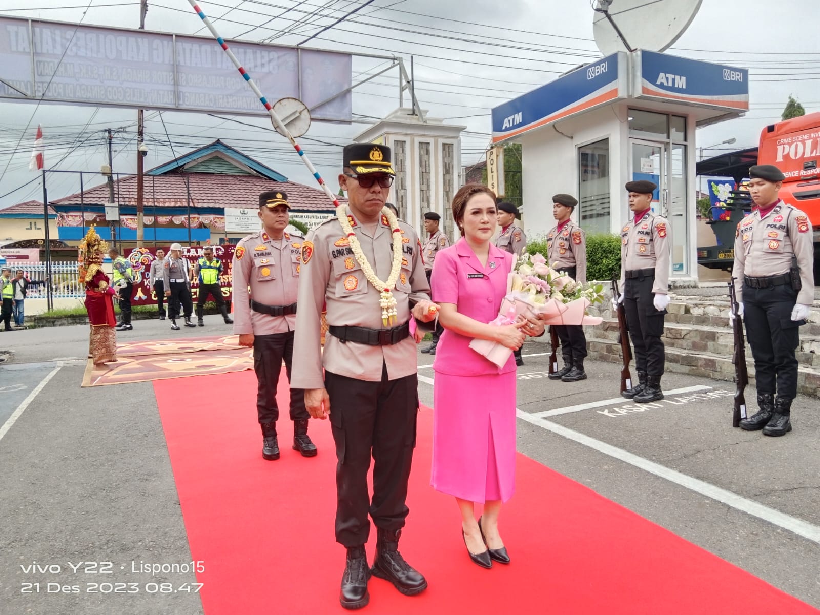 AKBP God Parlasri S. Sinaga SH. SIK. MH., didampingi oleh Ny. Lilis Sinaga dan Wakapolres Lahat, memasuki gerbang pora sebagai bagian dari tradisi kehormatan. Mereka melintasi pasukan pedang pora yang dengan gagah berani menyambut kepemimpinan baru.