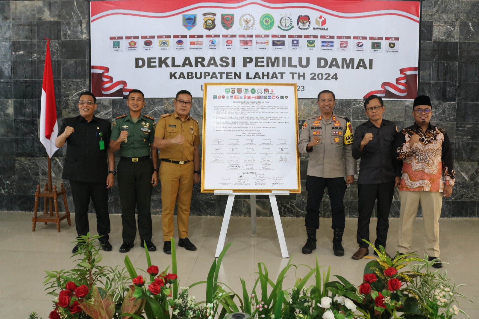 Lahat Halosumsel- Senin 04 desember 2023, bertempat di gedung pertemuan pemda lahat, kapolres lahat AKBP S. Kunto Hartono SIK. MT, menghadiri Deklarasi Damai Pemilu 2024, dalam rangka Ops Mantap Brata Musi 2023,2024, pengamanan pemilihan umum tahun 2024.