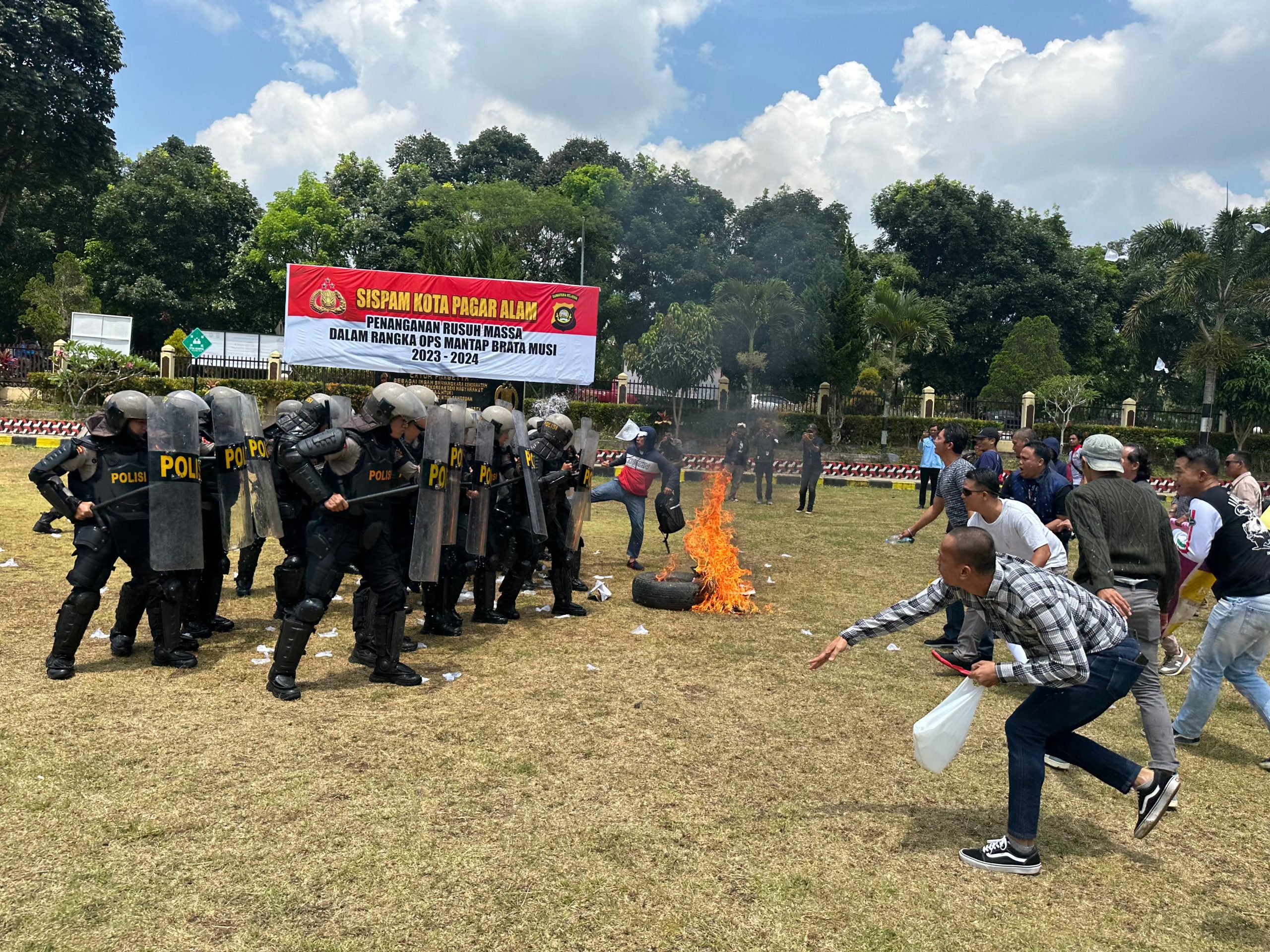 “Jadi digiat ini kita gambarkan simulasi kerusuhan massa yang menyerang dan memaksa masuk ke kantor KPUD serta massa menyerang blokade anggota Dalmas Polres Pagar Alam,” katanya.