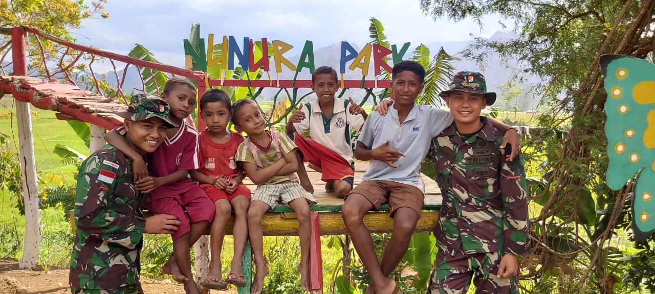 Diungkapkan Dansatgas, anak-anak tersebut dapat bermain di taman sederhana yang sengaja dibuat personel Pos Nunura Satgas Pamtas Yonif Raider 142/KJ disekitar Pos.