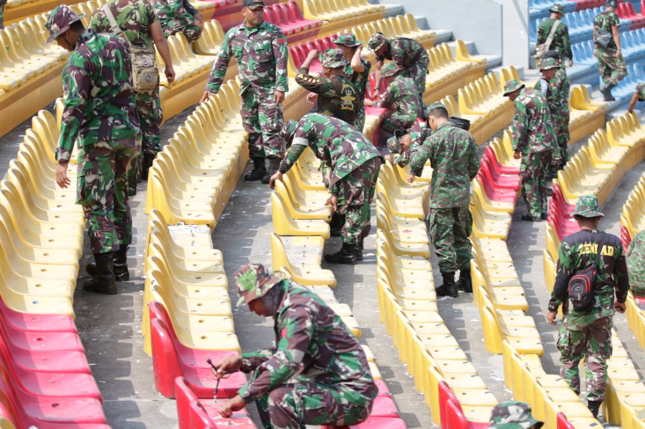 Prajurit TNI dari Zeni Konstruksi (Zikon) 12 Kodam II/Sriwijaya memperbaiki kerusakan kursi Stadion Gelora Sriwijaya Jakabaring, Palembang, Senin (23/7), dan sekaligus membersihkan area.