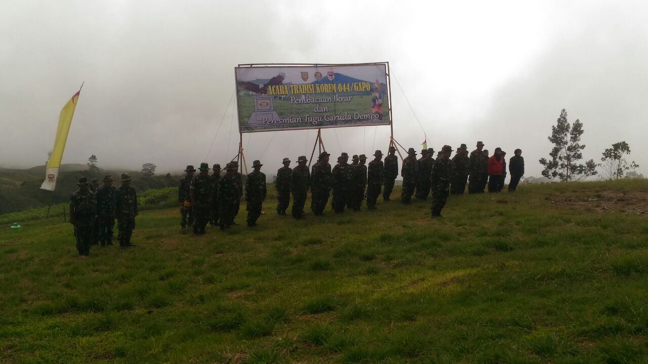 Komandan Korem 044/Gapo Kolonel Inf Kunto Arief Wibowo, S.I.P., buka acara tradisi satuan di gunung Dempo, sebanyak 130 Prajurit mengikuti kegiatan tradisi. Pada kesempatan tersebut, Komandan Korem 044/Gapo Kolonel Inf Kunto Arief Wibowo, S.I.P bertindak selaku Inspektur Upacara dan secara simbolik menyematkan tanda pita latihan kepada perwakilan peserta tradisi, sebagai tanda mereka telah menerima dan siap untuk melaksanakan tradisi. Rabu 26/10/2016.