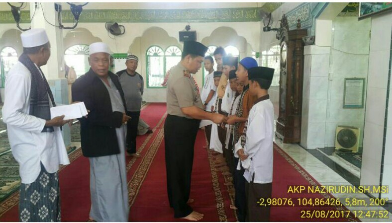 Kapolsek Mariana Bersama Personil Melaksanakan Kegiatan Sholat Jumat Bersama Masyarakat di Masjid Sabilul Huda serta pemberian santunan kepada 15 orang anak yatim piatu, asuhan Ponpes Babul Ulum Kelurahan Mariana Kecamatan Banyuasin I Kabupaten Banyuasin. Jumat (25/8/2017).