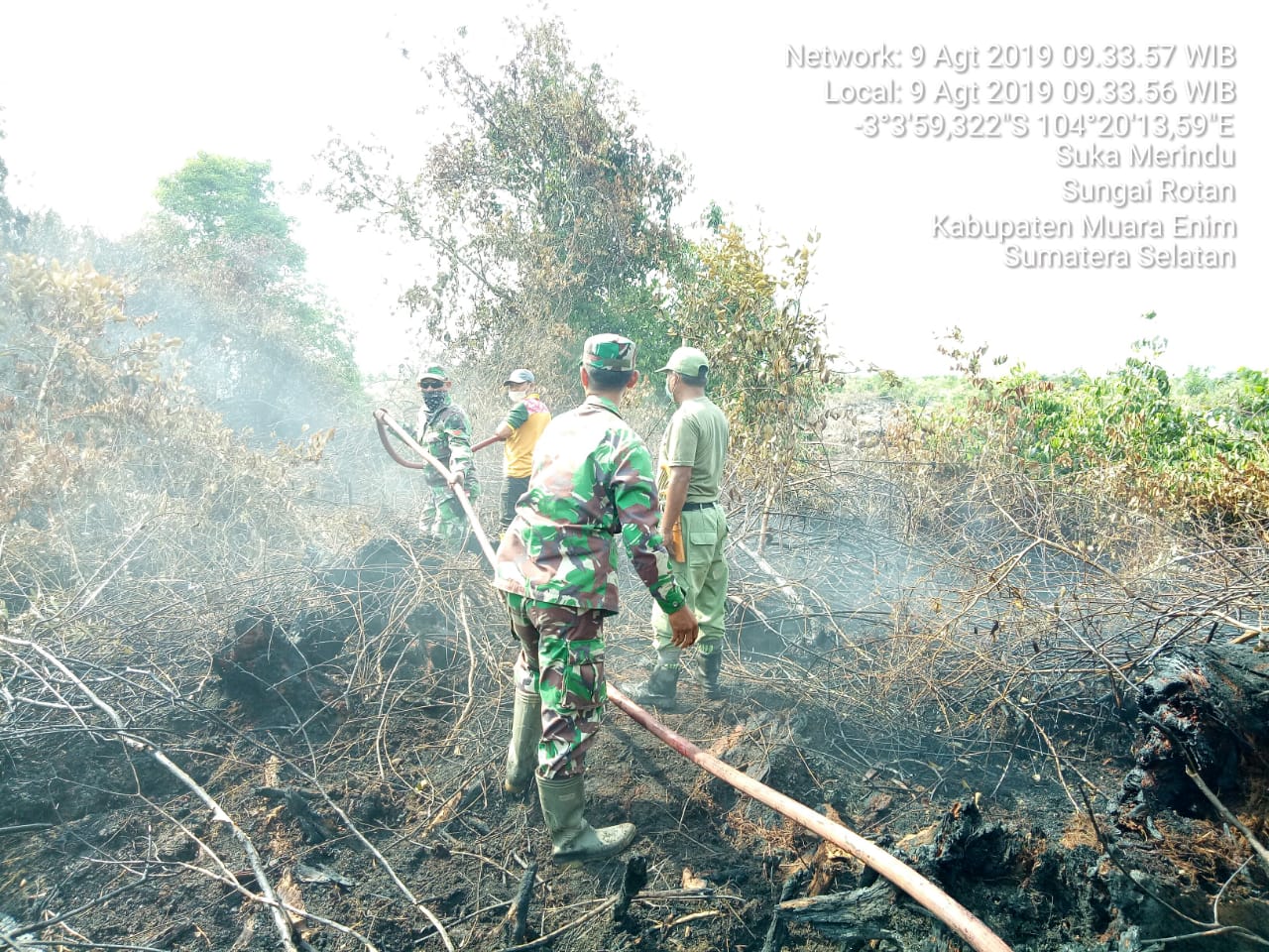 Satuan Tugas (Satgas) Kebakaran Hutan dan Lahan (Karhutla) Sumatera Selatan (Sumsel) mengerahkan Tim Satgas Darat dan Satgas Terpadu Karhutla ke beberapa titik api yang berada di wilayah Desa Suka Merindu Kec. Sungai Rotan Kab. Muara Enim yang mengalami kebakaran hutan dan lahan pada Jumat (9/8/2019).