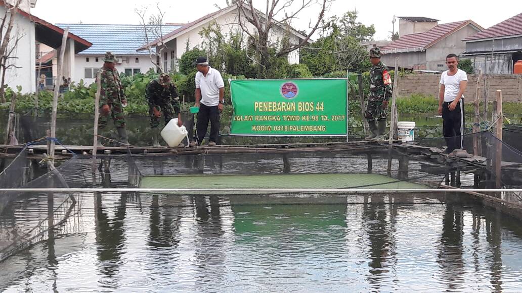Untuk membantu masyarakat dalam produktivitas hasil perikanan, Satgas TMMD ke 98 Kodim 0418/Palembang TA 2017 melalui Dan SSK Kapten Inf Fariq Abduh memberikan bantuan BIOS 44 kepada masyarakat yang membudidayakan ikan di kolam.