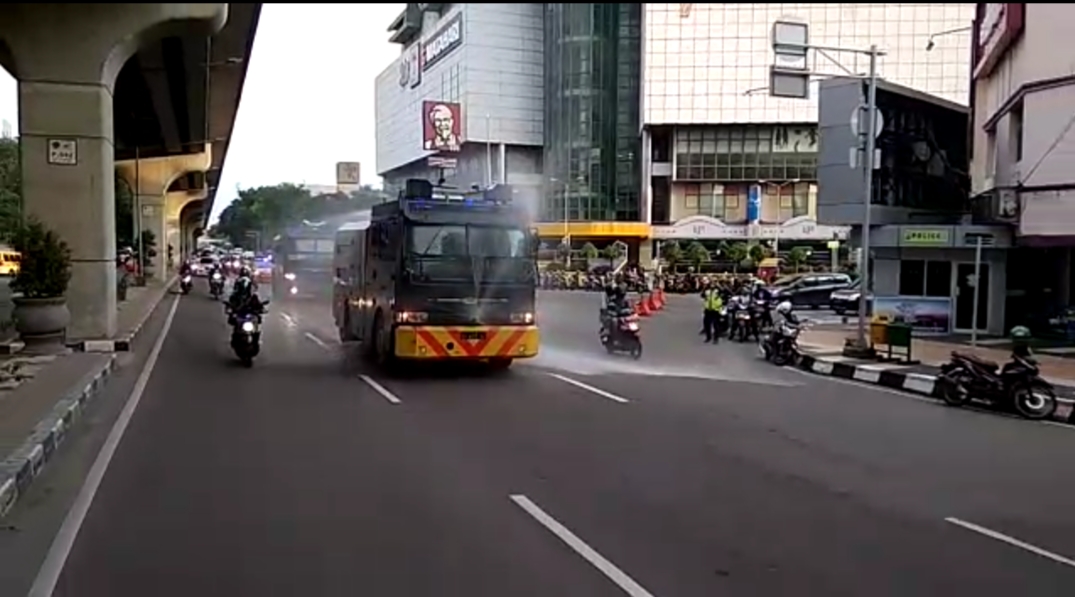“Betul, kita menyemprotkan disinfektan dengan menerjunkan water canon. Kita berkeliling mengitari jalan utama yang sering di lalui masyarakat, khususnya Jalan Jendral Sudirman, Jalan Basuki Rahmat, Jalan Atmo dan Jalan HM Riacudu Palembang,” jelas Kapolrestabes Palembang, Kombes Pol Anom Setyadji melalui Kabag Ops, AKBP Eddy, kepada awak media.