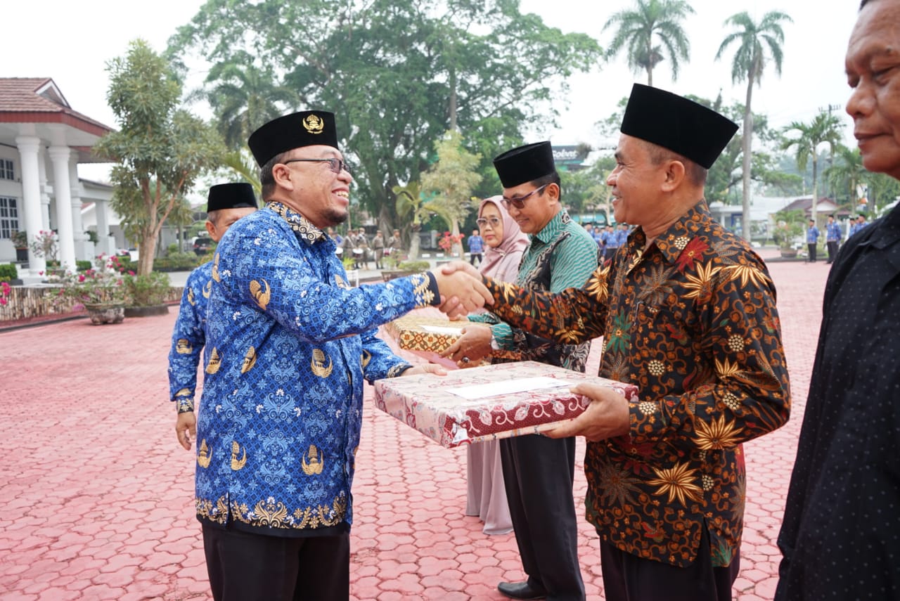 Sebelum memulai pidatonya, Sekda menyerahkan Penali Kasih kepada PNS yang pensiun.