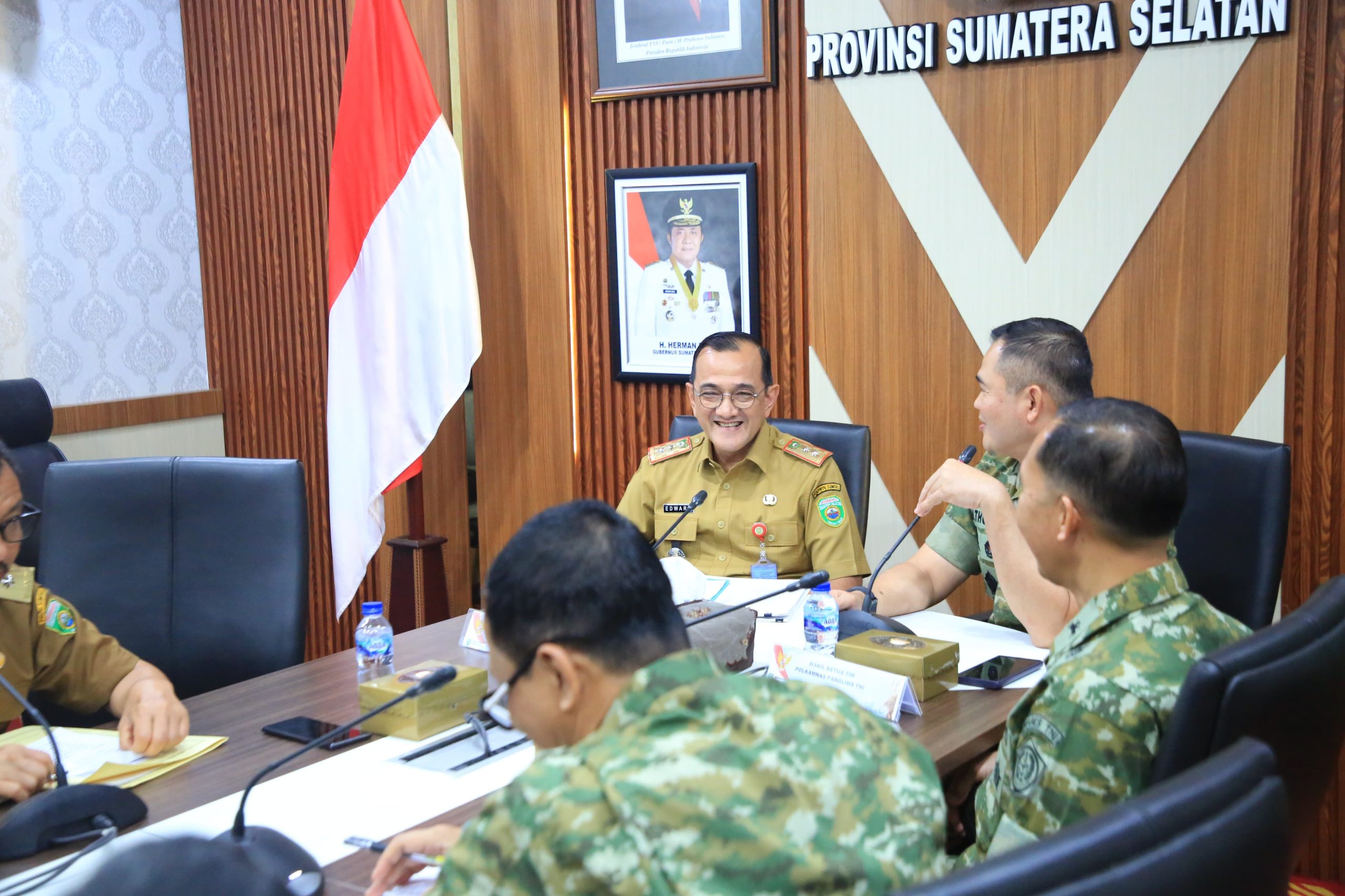 Palembang, Halosumsel– Sekretaris Daerah Provinsi Sumatera Selatan, Dr. Drs. H. Edward Candra, M.H., menerima audiensi Perwira Staf Ahli Tingkat III Bidang Politik dan Keamanan Nasional Panglima TNI, Mayjen TNI Budi Hariswanto, bersama tim dalam rangka pengumpulan data untuk penyusunan kajian strategi penyelesaian konflik tenurial pertahanan. Pertemuan tersebut berlangsung di Ruang Rapat Setda Provinsi Sumsel, Selasa (21/04/2026).
