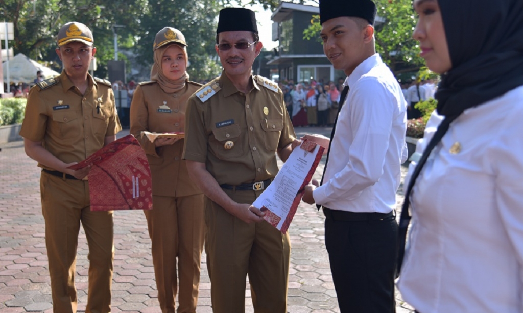 Senyuman bahagia Calon Pegawai Negeri Sipil (CPNS) dilingkungan Pemerintah Kota (Pemkot) Palembang, Senin (18/3/2019) pagi terlihat jelas, saat penyerahan SK kepada 763 CPNS dari Walikota Palembang H.Harnojoyo dihalaman Sekretariat daerah (Setda) Kota Palembang.