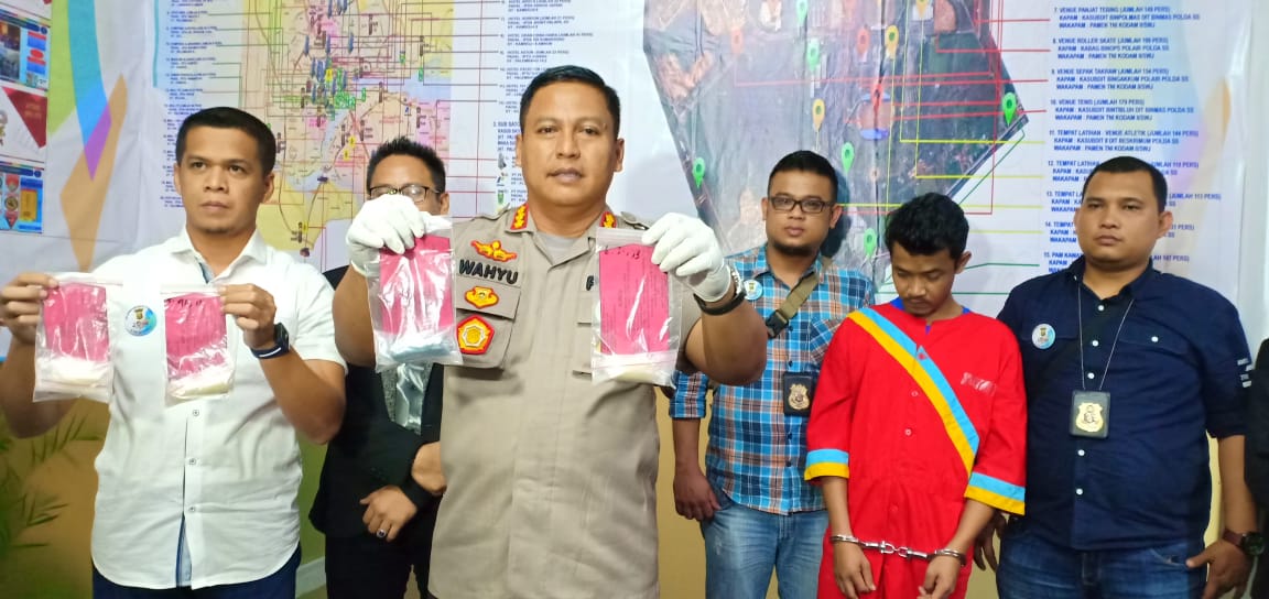 “Penyelidikan kita ini sudah beberapa bulan terakhir. Ini bukti dari kerja keras Sat Res Narkoba Polresta pada Jumat (10/8) pukul 19.00 WIB, dimana saat tersangka melintas di Jalan Sudirman, terlihat aneh. Saat dilakukan pengeledahan, yang bersangkutan bertingkah aneh. Ketika dilakukan interogasi mendalam, akhirnya mengungkap kalau dalam perutnya tersimpan narkotika sebanyak tujuh kantong karet berisi shabu yang beratnya dimulai dari 20 sampai 50 gram. Selain itu, ada juga terdapat pil happy five di dalamnya,” jelas Kapolresta Palembang, Kombes Pol Wahyu Bintono Hari Bawono SIk SH MH didampingi Kasat Reserse Narkoba, Kompol Achmad Akbar SIk SH saat press release di Posko Pengamnn Asean Games Lippo Jakabaring, Senin (13/8).