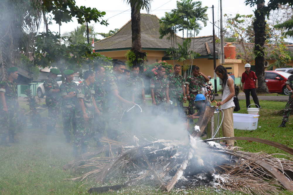 Danrem 044/Gapo Kolonel Inf Kunto Arief Wibowo, S.IP. menyaksikan demonstrasi pemadaman api dengan menggunakan tekhnologi busa anti api (Nusantara Gapo 44) yang diciptakan oleh Tim Riset Korem 044/Gapo di lapangan Makorem 044/Gapo (22/6/2016).