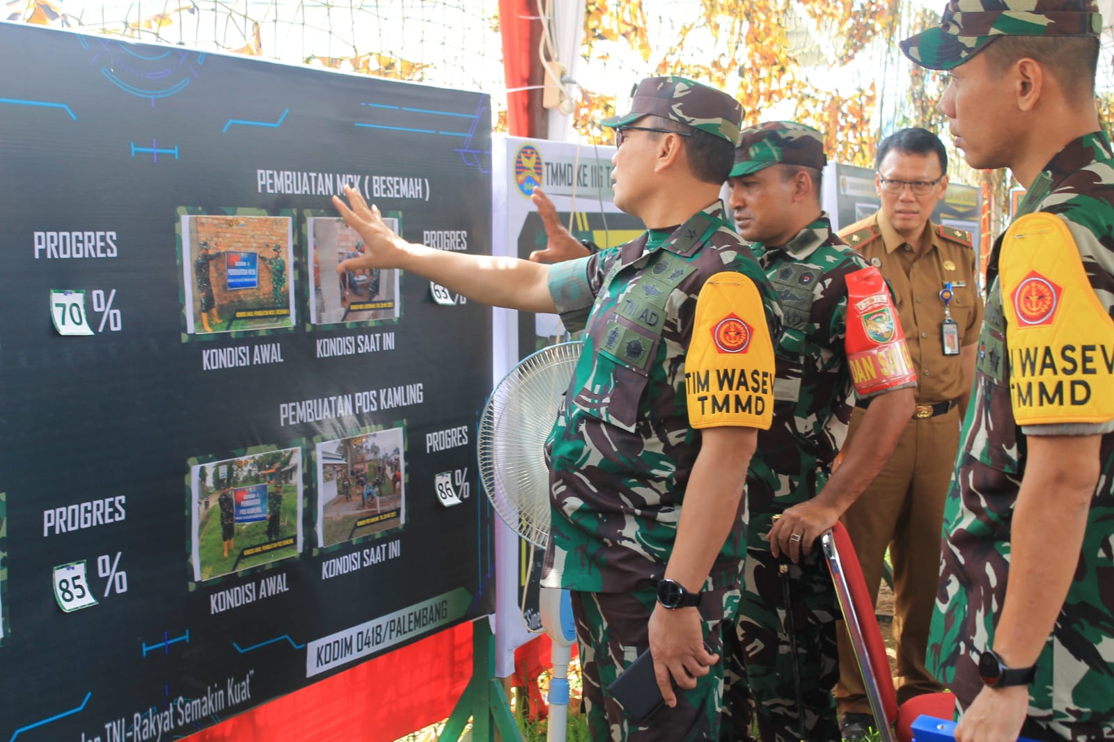 PALEMBANG, Halosumsel- Ketua Tim Wasev, Brigjen TNI Parlindungan Hutagalung melihat perkembangan kegiatan pembangunan pada program TMMD ke-116 di wilayah Kodim 0418/Palembang.