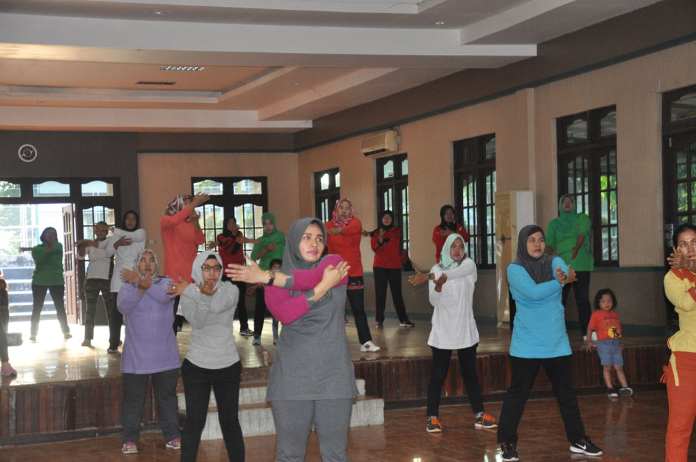 Ibu-Ibu Persit Kartika Chandra Kirana(KCK) Koorcab Rem 044 Gapo PD II/Sriwijaya melaksanakan kegiatan olahraga bersama senam aerobik bersama di lapangan Apel Makorem 044/Gapo sebagai bagian dari pembinaan Persit di lingkungan Korem 044/Gapo, Jumat (4/8/2017).