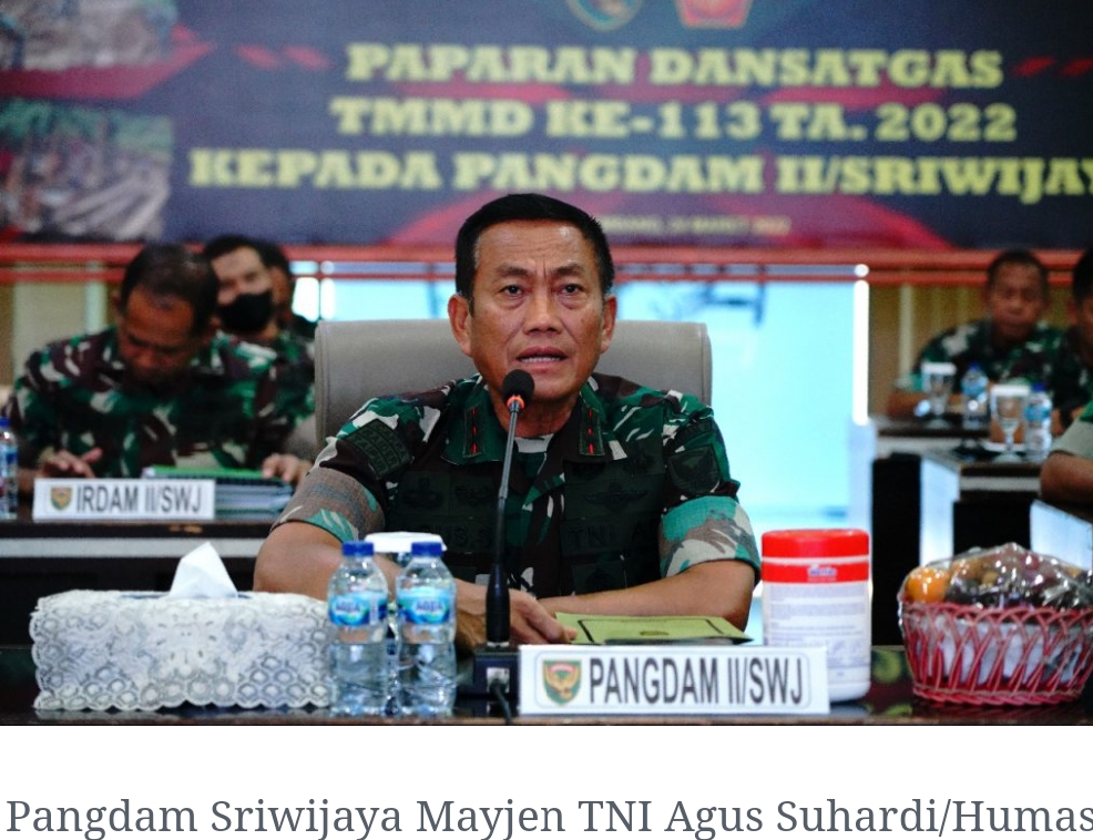 Untuk meyakinkan pelaksanaan TMMD Ke-113 TA 2022 di wilayah Kodam II/Swj dapat berjalan sesuai perencanaan yang sudah diprogramkan, dalam kegiatan tersebut Pangdam II/Swj Mayjen TNI Agus Suhardi, menerima paparan dari para Dandim jajaran yang menjabat sebagai Dansatgas TMMD Ke-113 TA 2022.