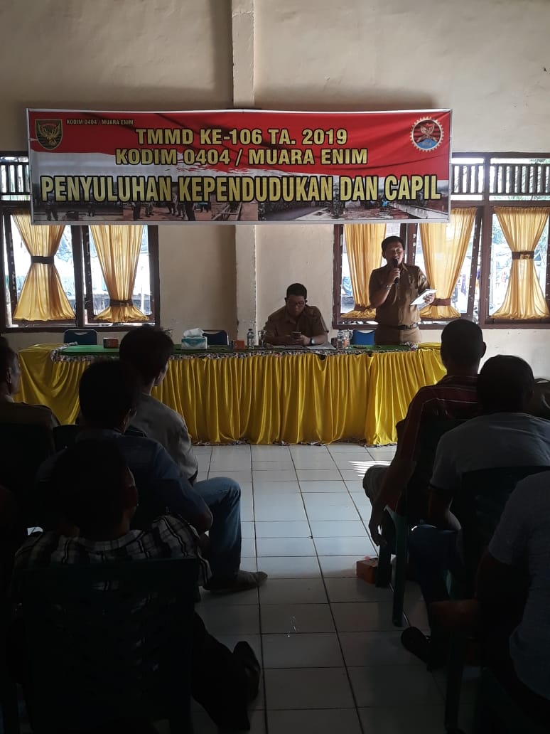 Program TMMD Ke 106 TA. 2019 Satgas Kodim 0404/Muara Enim bekerja sama dengan Dinas Kependudukan dan Catatan Sipil Kabupaten Muara Enim memberikan penyuluhan sebagai sarasanan non pisik yang berlangsung di Balai Desa Beringin kecamatan Lubai Kabupaten Muata Enim (14/10/19)