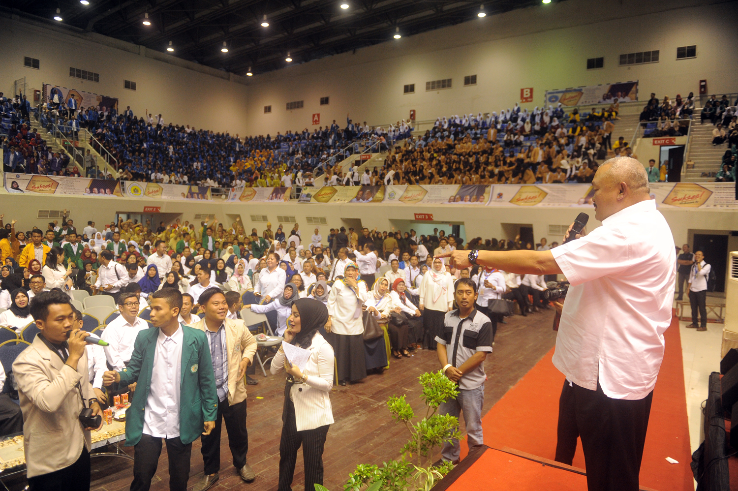 Semangat Gubernur Sumsel Alex Noerdin untuk mensosialisasikan Asian Games tak pernah kendur. Senin (12/2) misalnya, baru saja pulang dari Jakarta karena tugas, pelopor sekolah gratis itu langsung kembali “jualan” alias mensosialisasikan Asian Games di hadapan ribuan mahasiswa se Sumsel di Palembang Sport and Convention Center ( PSCC).