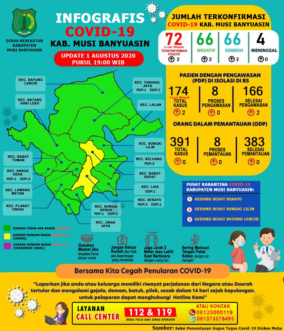 Sementara itu, data update 1 Agustus 2020 Gugus Tugas COVID-19 Muba melaporkan tercatat ada sebanyak 391 ODP 383 selesai pemantauan masih dipantau 8 orang, 547 OTG 544 selesai pemantauan 3 masih dipantau, 174 PDP 8 proses pengawasan 166 selesai pengawasan.her
