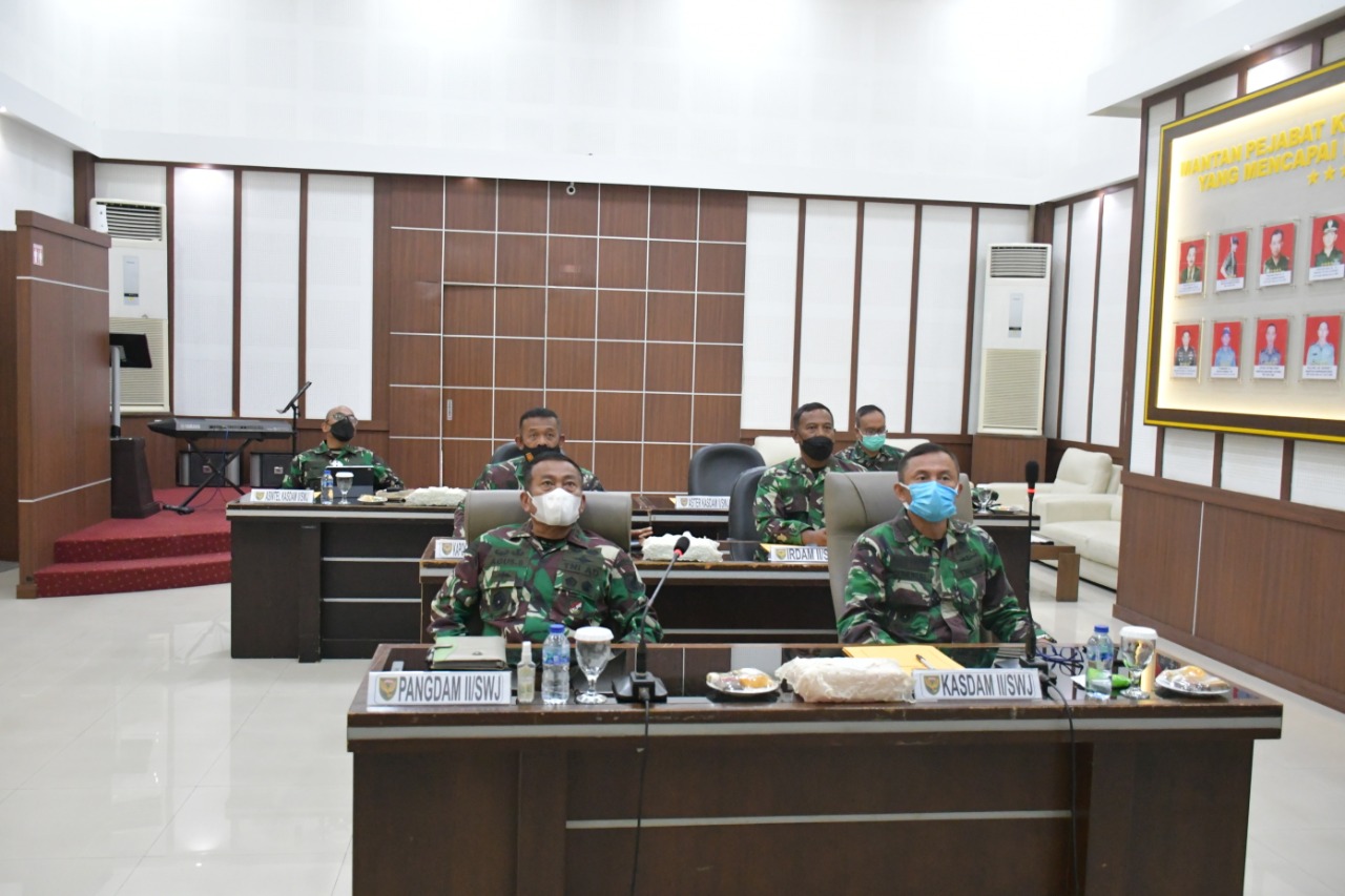 Panglima Kodam II/Sriwijaya Mayjen TNI Agus Suhardi, mengikuti Rapat Evaluasi Penanganan Covid-19, Program Vaksinasi, serta menghadapi Natal dan Tahun Baru 2022 yang dipimpin oleh Panglima TNI, Marsekal TNI Hadi Tjahjanto, S.I.P., secara virtual, di Ruang Gatot Subroto Makodam II/Swj Jln. Jenderal Sudirman KM. 2,5 Palembang, Selasa (26/10/2021).