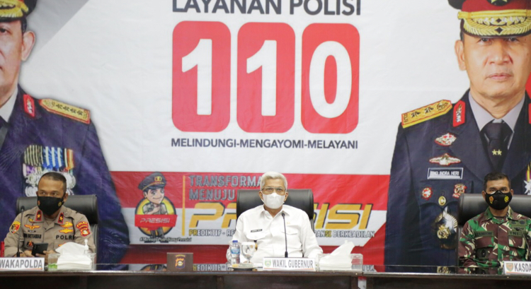Wakil Gubernur Sumatera Selatan H Mawardi Yahya bersama Wakapolda Sumsel Brigjen Pol Rudi Setyawan dan Kasdam II Sriwijaya Brigjen TNI Muhammad Zamroni menghadiri launching layanan polisi 110 secara virtual dari ruang Rekonfu Mapolda Sumsel.