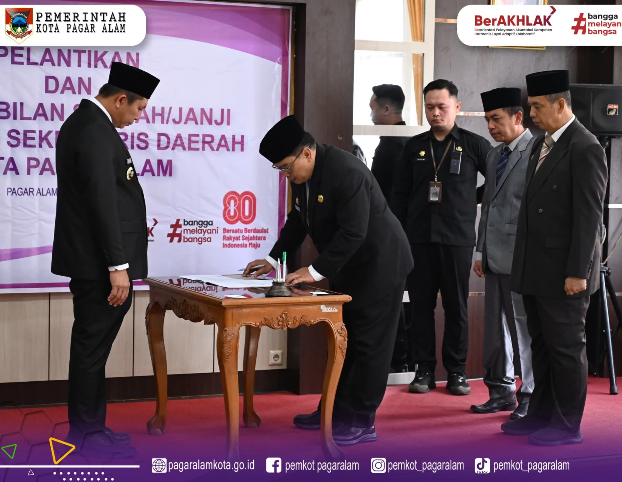 Pagar Alam, Halosumsel -Wali Kota Pagar Alam Ludi Oliansyah melantik Kepala Dinas Kependudukan dan Pencatatan Sipil Zaily Oktosab Fitri Abidin, menjadi Penjabat (Pj) Sekretaris Daerah (Sekda) Kota Pagar Alam, bertempat di Ruang Rapat Besemah Due, Kantor Wali Kota Pagar Alam, pada Jum’at pagi (08/08/2025).