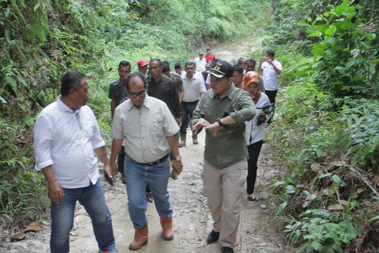 Menelusuri jalan setapak sepanjang 1,8 km dalam kondisi wilayah hutan, Wakil Bupati Musi Banyuasin (Muba), Beni Hernedi didampingi Chief Manager PT Hindoli,Joko Pranoto, Camat Keluang, Debby Harianto SSTP MSi, Kabid Dinas Perkebunan dan Dinas PUPR jalan kaki bersama, guna mengecek kangsung keinginan warga tanjung dalam serta melihat kondisi jalan di Desa Tj dalam Kecamatan Keluang ini .