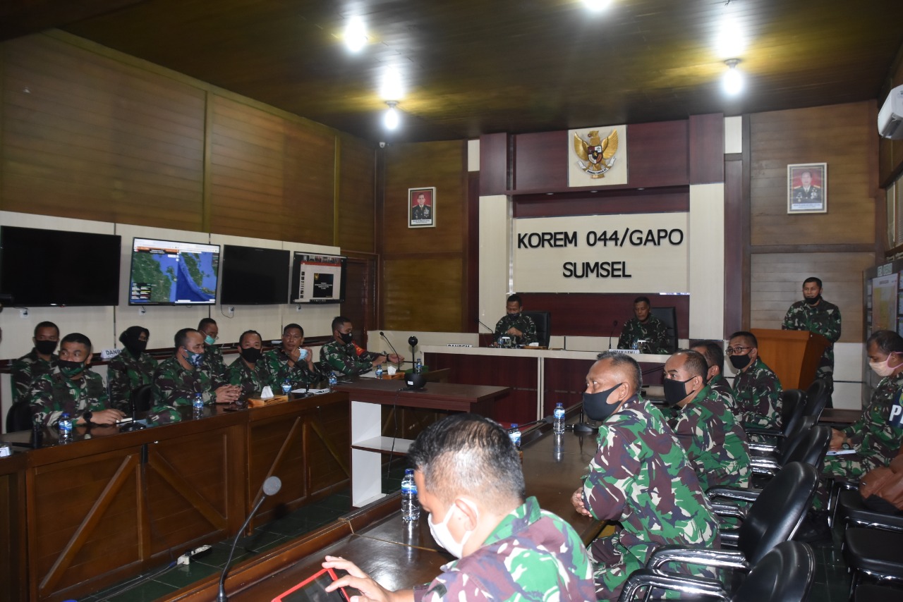 Bertempat di Ruang Yudha Makorem 044/Gapo Jl.Jendral Sudirman KM 4,5 Kel. 20 Ilir Kec. Ilir Timur I Kota Palembang berlangsung kegiatan Video Confference Taklimat Akhir Wasum Itdam II/Swj TW II TA 2020 di Satuan Jajaran Korem 044/Gapo.